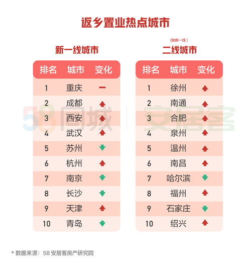“回去還是留下”,對于“漂一族”的年輕人來說,已經不僅僅是一道選擇題那么簡單。近日,58同城、安居客發布《2019-2020年返鄉置業調查報告》(以下簡稱《2020年返鄉置業調查報告》)。報告顯示,全國范圍來看,新一線城市重慶連續三年為返鄉置業的熱門城市第一位,成都、西安位列第二、三位,排名上升;其他二線城市中,徐州位列返鄉置業熱門城市首位,南通、合肥等城的熱度也相對靠前。