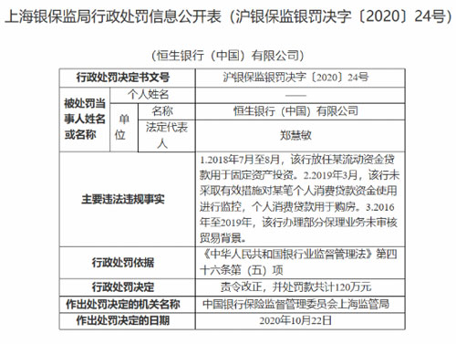 銀保監(jiān)會(huì)網(wǎng)站消息,恒生銀行(中國)有限公司因2018年7月至8月,放任某流動(dòng)資金貸款用于固定資產(chǎn)投資。2019年3月,未采取有效措施對某筆個(gè)人消費(fèi)貸款資金使用進(jìn)行監(jiān)控,個(gè)人消費(fèi)貸款用于購房。2016年至2019年,辦理部分保理業(yè)務(wù)未審核貿(mào)易背景。三項(xiàng)違法違紀(jì)事實(shí)被上海銀保監(jiān)局處罰款120萬元并責(zé)令改正。