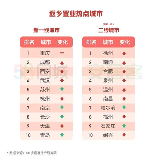 數據顯示,除一線城市之外,二線城市中,徐州位列返鄉置業熱門城市首位,南通、合肥等城的熱度也相對靠前。值得一提的是,與上述返鄉置業熱門城市不同,東北地區的返鄉置業熱度有所下降,僅哈爾濱一城位列其中。