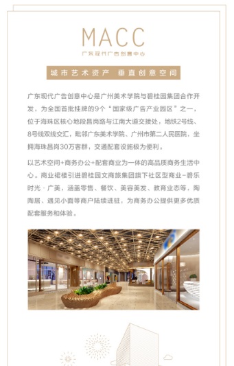 廣東現代廣告創意中心由碧桂園文商旅集團全力管理運營,作為碧桂園集團旗下專注商業文旅資產的運營平臺,商業總量逾 1015 萬㎡,商業項目超 100 個,戰略合作品牌商家1000+家,囊括購物中心、社區商業、商業綜合體、長租公寓、品質辦公等等。