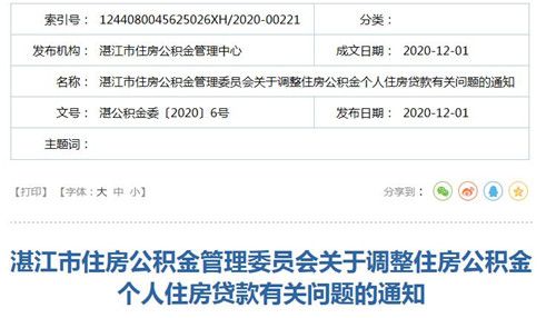 房訊網訊 近日,湛江市住房公積金管理中心發布《關于調整住房公積金個人住房貸款有關問題的通知》。通知指出,為更好地滿足繳存職工購建住房能力,支持繳存住房公積金職工合理住房需求,進一步促進湛江市住房公積金業務健康發展,對住房公積金個人住房貸款有關問題做適當調整。 通知自2021年1月1日起執行,有效期五年。