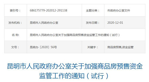 房訊網訊 12月2日,云南省昆明市政府辦公室下發了《關于加強商品房預售資金監管工作的通知(試行)》,要求昆明市主城五區及三個國家級度假區范圍內辦理商品房預售許可證的項目,其商品房預售資金需按照政府指導、銀行監管、專戶?畹脑瓌t進行監管。