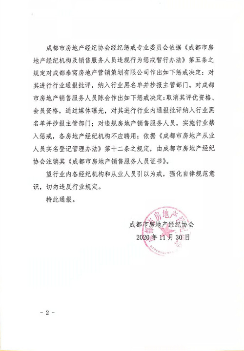 成都房協(xié)對成都泰窩進行行業(yè)通報批評,納入行業(yè)黑名單并抄報主管部門。