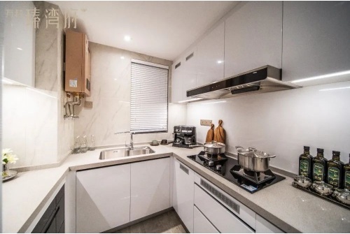 廚房為“U”型設計,“U”型廚房將儲藏區、洗滌區、烹飪區,三個廚房使用頻率較高的區域連線,形成高效的黃金三角位,小幅側身移動即可完成烹飪工作。