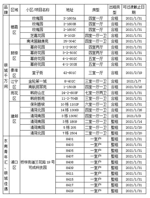 據(jù)南京住房保障和房產(chǎn)局發(fā)布的信息,南京市住房租賃行業(yè)協(xié)會(huì)秘書長(zhǎng)單位東南公寓公司、副會(huì)長(zhǎng)單位銀城佳遇、銀城千萬間已梳理出第一批免費(fèi)過渡房源,這些房源主要分布于鼓樓、建鄴、棲霞、浦口等區(qū),共計(jì)30套房源。