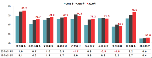 針對(duì)客戶滿意度十大關(guān)鍵端口,《白皮書》顯示,2020年銷售服務(wù)和物業(yè)服務(wù)的得分排在前兩位;戶型設(shè)計(jì)、公區(qū)質(zhì)量、整改維修滿意度均出現(xiàn)下滑情況,投訴處理慢速上升,其他端口增速放緩,均低于2019年提升幅度。其中尤以戶型設(shè)計(jì)下降最為明顯,究其原因主要是受疫情影響導(dǎo)致業(yè)主對(duì)產(chǎn)品空間及功能要求迅速提升。