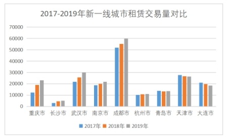 結(jié)合2017-2019三年各樣本城市租房成交量橫向?qū)Ρ确治觯^明顯的趨勢就是,以北京、上海、深圳為代表的一線城市,交易量均出現(xiàn)了下降。以重慶、長沙、武漢為代表的新一線城市,租房成交套數(shù)漲幅均超過一線城市。其中,重慶租房交易量增幅較明顯。