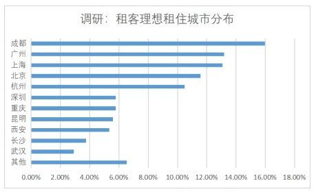 雖然從租客租住城市分布情況來看,租客主要居住在北京、上海、廣州、深圳等一線城市,但在租客理想居住城市調(diào)研中,16%的租客認(rèn)為住在成都最幸福,成都成為租客最理想的居住城市。