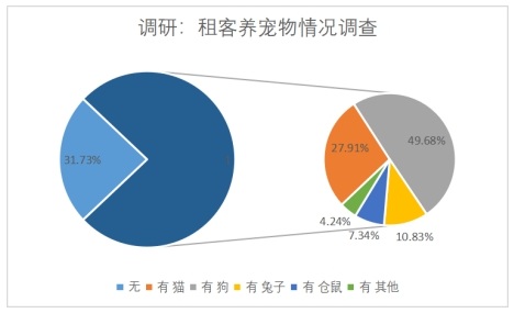 寵物不再是有房一族的專屬,伴隨著寵物經(jīng)濟(jì)的興起,越來越多租客也開始卷入“擼貓遛狗”的大潮中。問卷調(diào)研中,近7成租客已至少養(yǎng)有1只寵物,在寵物類型調(diào)研中,49.68%的租客養(yǎng)狗,27.91%的租客養(yǎng)貓。此外,兔子、倉鼠等小型寵物也開始受不少租客青睞。由于租客的獨(dú)居化、個性化的趨勢,寵物開始成為租房生活中的陪伴。而據(jù)Frost&Sullivan數(shù)據(jù)顯示,接近1億戶的養(yǎng)寵家庭花在寵物貓/狗的單只年均消費(fèi)額達(dá)到3969元。對于租客而言,租金之外還附加了對于品質(zhì)生活的投資,其消費(fèi)能力日益提升。