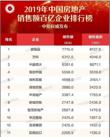 中國指數(shù)研究院2019中國房地產(chǎn)銷售額百億企業(yè)排行榜