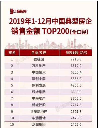 億翰智庫2019年1-12月中國典型房企銷售金額TOP200榜單