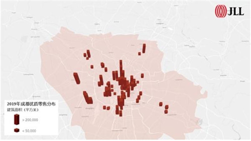數據顯示,2019年,成都優質零售物業市場共有八個購物中心及街區商業項目開業,共計76.4萬平方米,總存量達到890萬平方米,僅次于上海、北京,位居全國第三。其中,成都零售商業開發繼續下沉至二圈層,近郊商圈迎來集中供應,新增供應總計51.8萬平方米,同比增長74.6%。