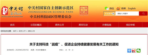 房訊網訊 近日,中關村管委會發布《關于支持科技“戰疫”、促進企業持續健康發展有關工作的通知》,支持中關村國家自主創新示范區各類創新創業主體充分發揮科技創新優勢和支撐作用,加速科技成果在防控治療一線的轉化應用,同時減輕疫情對中小微企業生產經營影響,幫助企業共渡難關、實現持續健康發展。
