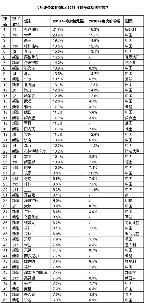 胡潤百富董事長兼首席調研員胡潤表示稱,2019年全球房價漲幅最高的前50名城市中,美國的上榜城市數(shù)量出現(xiàn)三年來最大的一次降幅,東歐快速上漲。