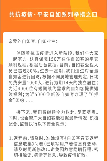 2月20日,針對全國各城市開始現返程、復工高峰,抗擊疫情進入新階段,自如發布新公告《共抗疫情·平安自如 系列舉措之四》,公布此前陸續推出的各項舉措已有成果及最新安全提示。