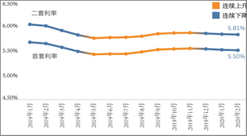 融360|簡普科技大數據研究院對全國35個重點城市533家銀行分支機構房貸利率的監測數據顯示,2020年2月(數據采集期為2020年1月20日-2020年2月19日),全國首套房貸款平均利率為5.50%,環比下降1BP,為對應期限5年期LPR加點70BP;二套房貸款平均利率為5.81%,環比下降1BP,為5年期LPR加點101BP。