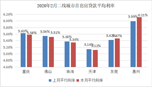 與其他省份相比,2月廣東省各城市房貸利率波動幅度相對較大,波動幅度在3BP及以上的11個城市中,6個屬于廣東。全國首套房貸款利率最低十城市中,2020年2月,6個城市的首套房房貸利率水平有所下降,其中,珠海環比下降4BP至5.34%,將杭州擠出最低十城市。最高前十城市名單不變,惠州地區首套房貸利率平均水平為6.11%,環比高達12BP的漲幅,使其一躍成為全國房貸利率第二高城市。
