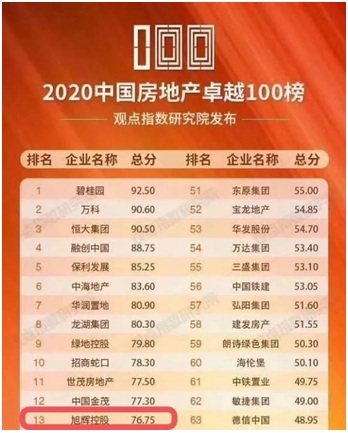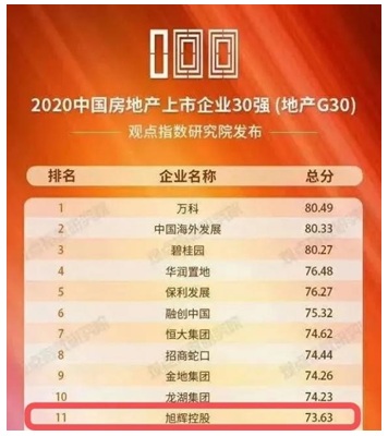2020中國房地產上市企業30強榜單(旭輝位列11)