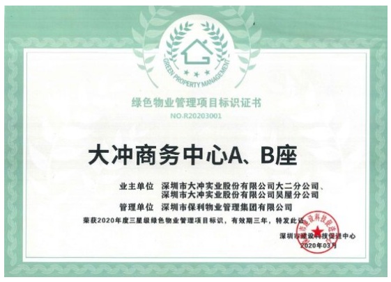 根據《<深圳經濟特區物業管理條例>實施若干規定》(市政府令第258號)、《綠色物業管理評價標準》(SJG50-2018),深圳市建設科技促進中心組織完成了大沖商務中心A、B座項目的專家評審與現場核查工作。并于2020年3月6日通過官方公示。大沖商務中心獲得了深圳市綠色物業管理項目星級評價標識三星級認證,這也是2020年度首批獲得“三星級綠色物業管理項目”稱號的物業企業。