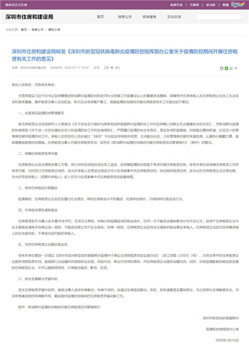 3月17日,深圳市住房和建設局轉發(fā)《深圳市新型冠狀病毒肺炎疫情防控指揮部辦公室關于疫情防控期間開展住房租賃有關工作的意見》(簡稱《意見》),《意見》要求保持住房租金價格穩(wěn)定,同時引導依法理性減免租金,支持住房租賃企業(yè)穩(wěn)定現(xiàn)金流。