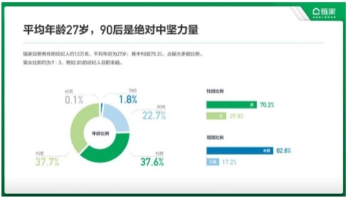 數(shù)據(jù)顯示,目前鏈家有在職經(jīng)紀(jì)人約13萬名,平均年齡為27歲。其中90后是這一群體的中堅(jiān)力量,占比為75.3%。