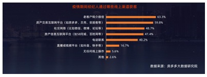 報(bào)告數(shù)據(jù)顯示,多數(shù)經(jīng)紀(jì)人在疫情期間通過(guò)線上房產(chǎn)交易服務(wù)平臺(tái)與社交網(wǎng)絡(luò)渠道獲客;其中63.3%的經(jīng)紀(jì)人 通過(guò)老客戶轉(zhuǎn)介微信獲客,59.8%的經(jīng)紀(jì)人通過(guò)房產(chǎn)交易互聯(lián)網(wǎng)平臺(tái)(如房多多、貝殼、安居客等)獲客。線上房產(chǎn)交易服務(wù)平臺(tái)與社交網(wǎng)絡(luò)“組合劍”成為疫情期間獲客利器。