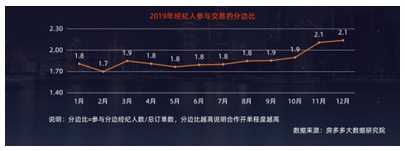 此外,跨經(jīng)紀(jì)公司的合作開(kāi)單漸成趨勢(shì), 83.3%的經(jīng)紀(jì)公司有過(guò)聯(lián)賣經(jīng)歷,其中,公司規(guī)模在1至3人的經(jīng)紀(jì)商戶合作意愿高達(dá)93.1%。據(jù)統(tǒng)計(jì)2019年12月分邊比為2.1,即成交1個(gè)訂單中就有2.1個(gè)經(jīng)紀(jì)人參與協(xié)作。