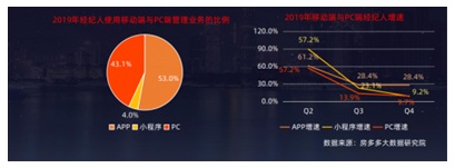 據(jù)房多多大數(shù)據(jù)研究院統(tǒng)計(jì),2019年經(jīng)紀(jì)人使用APP、小程序等移動(dòng)端作業(yè)工具管理業(yè)務(wù)的頻率遠(yuǎn)高于PC端,且仍呈現(xiàn)上升趨勢(shì)。2019年四季度APP端經(jīng)紀(jì)人用戶增速仍處于28.4%的較高增長(zhǎng)水平,而小程序與PC端經(jīng)紀(jì)人用戶增速逐漸趨于飽和。