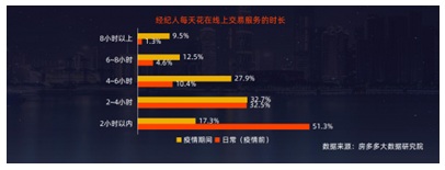 經(jīng)紀(jì)人移動(dòng)端設(shè)備使用率是PC端的10.9倍,經(jīng)紀(jì)人普遍對(duì)移動(dòng)端無(wú)縫跟進(jìn)房源與業(yè)主、及時(shí)有效的營(yíng)銷、高效溝通 客戶等特點(diǎn)表示認(rèn)可,越來(lái)越多平臺(tái)和用戶認(rèn)識(shí)到移動(dòng)端作業(yè)的重要性和便利性。數(shù)據(jù)顯示,疫情期間經(jīng)紀(jì)人在線時(shí)間顯著延長(zhǎng),超六成經(jīng)紀(jì)人在線時(shí)長(zhǎng)在2~6小時(shí)之間.