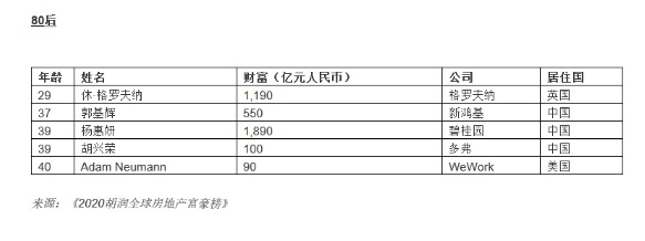 來自英國的29歲的休·格羅夫納以1190億人民幣的財富并列第五,他是榜單上最年輕的地產企業家。格羅夫納家族在倫敦兩個豪華高端區域梅菲爾和貝爾格拉維亞擁有面積約300英畝的土地。此外,牛津、柴郡等全球60個城市都遍布格羅夫納家族的房地產業。其他4位80后房地產富豪分別為37歲的新鴻基郭基輝、39歲的楊惠妍、39歲多弗胡興榮和WeWork的AdamNeumann(40歲)。
