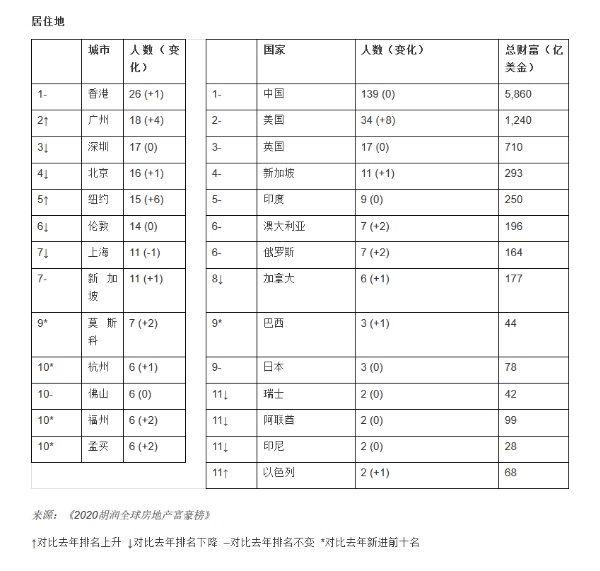 胡潤研究院指出,中國以139位十億美金地產企業家位居全球首位,美國以34位排名第二,英國以17位排名第三。從財富來看,中國也占主導地位,占全球地產企業家總財富的60%。以城市來看,香港以26位排名第一。紐約是唯一一個進入前五名的非中國城市。
