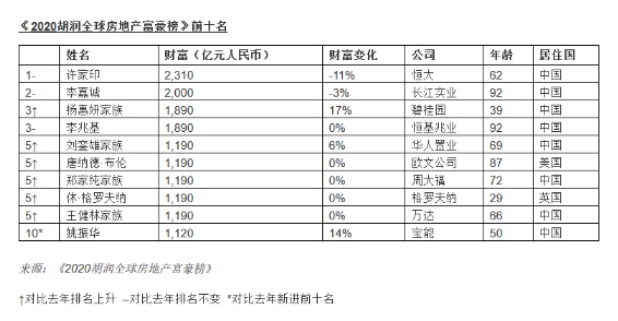 《2020胡潤全球房地產富豪榜》顯示,前十名依次為許家印(2310億元人民幣,下同)、李嘉誠(2000億)、楊惠妍家族(1890億)、李兆基(1890億)、劉鑾雄家族(1190億)、唐納德·布倫(1190億)、鄭家純家族(1190億)、休·格羅夫納(1190億)、王健林家族(1190億)、姚振華(1120億),其中許家印、李嘉誠財富分別縮水11%和3%,楊惠妍家族、姚振華財富分別增加17%和14%。對比2019年,姚振華為今年(2020年)新進前十名。