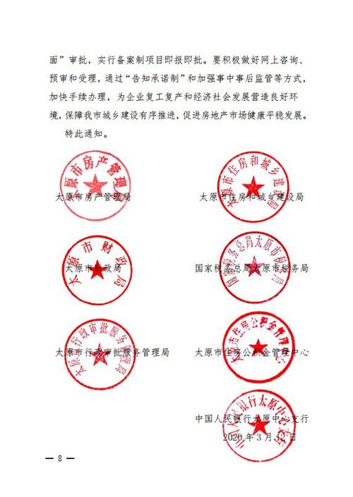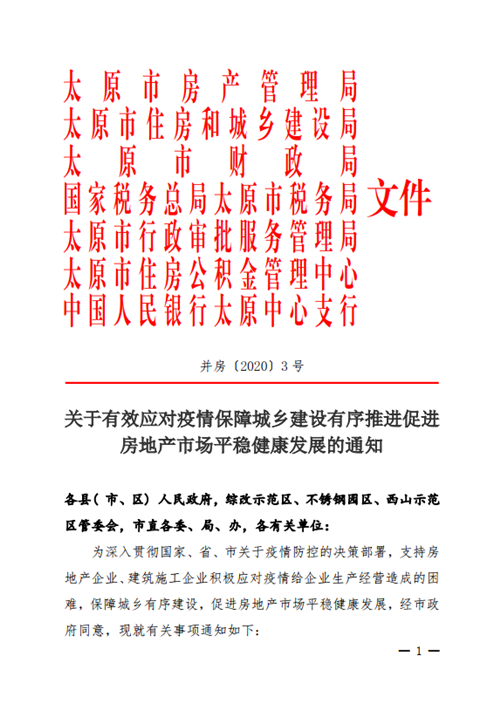 3月12日,山西省太原市房產管理局、太原市住房和城鄉建設局、太原市財政局、國家稅務總局太原市稅務局等七個部門聯合發布《關于有效應對疫情保障城鄉建設有序推進促進房地產市場平穩健康發展的通知》(簡稱《通知》),《通知》顯示,為支持房地產企業、建筑施工企業積極應對疫情給企業生存經營造成的困難,促進房地產市場平穩健康發展,共出臺了15項措施。