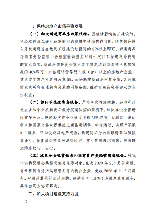 在加強金融領域政策支持方面,《通知》顯示要加強差異化優惠金融服務。要按照“房住不炒”“因城施策”總體要求,保持房地產信貸合理適度增長,不得抽貸、斷貸、壓貸,緩解企業資金流動困難,為房地產企業恢復生產經營提供有力的信貸支持。對受疫情影響到期還款困難的企業,各銀行業金融機構可按規定予以展期或續貸。