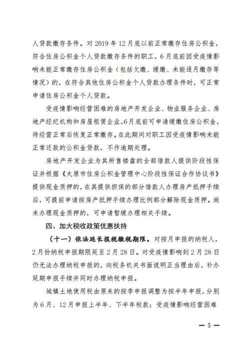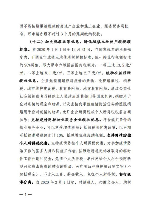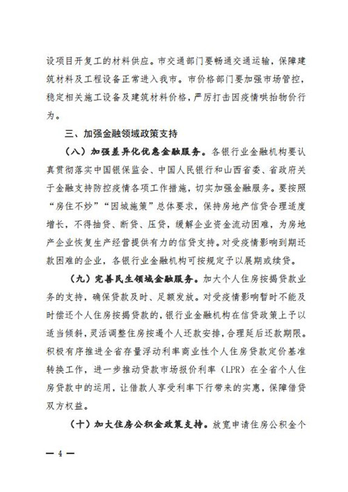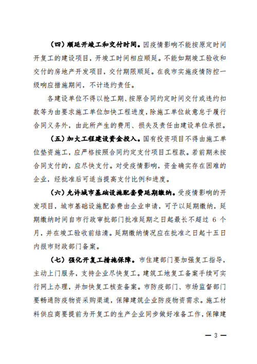在順延開竣工和交付時間方面,《通知》指出因疫情影響不能按原來時間開復工的建設項目,開竣工時間相應順延。不能如期竣工驗收和交付的房地產開發項目,交付期限順延。在太原市實施疫情防控一級相應措施期間,不計違約責任。