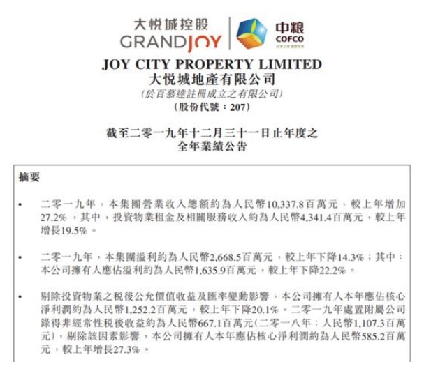 大悅城地產2019年溢利約為26.69億元,同比下降14.3%;其中股東應占溢利為16.26億元,同比下降22.2%;剔除投資物業之后公允價值收益及匯率變動影響,大悅城地產股東應占核心凈利潤約為12.52億元,同比下降20.1%。