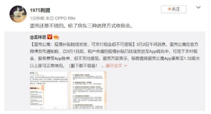 就在3月2日,蛋殼公寓官方發布消息,自3月1日起,租客申請的疫情補貼已陸續發放,可支付租金、服務費等App賬單。