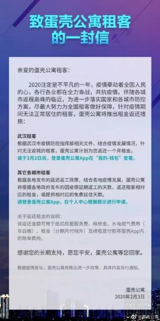 2月3日,蛋殼公寓發布公告《致蛋殼公寓租客的一封信》,公布疫情期間對全體租客的補貼政策。這是目前國內分散式長租公寓企業中首家正式公開發聲,為疫情期全體受影響的租客提供租金補貼的企業。