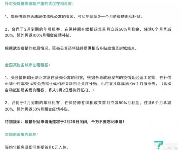 2月13日,蛋殼再次做出回應,表示將加碼優惠政策,續租租客的首月租金立減50%,住滿6個月后再返20%的月租金。另外,在優惠活動基礎上,租客將額外享受專屬疫情補貼。武漢地區,住滿1個月后將返還100%月租金;非武漢地區,住滿1個月后返還50%月租金。