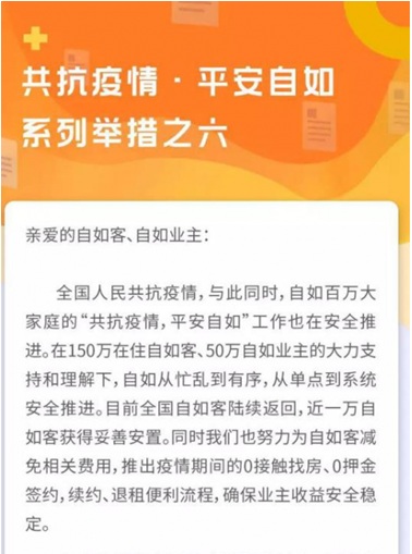 這是疫情以來自如發布的第六次抗疫舉措。此前其推出的多項舉錯中包括:協助社區和相關政府部門收集租客返程信息;按時為業主支付租金;為全國150萬在住租客減免2月50%服務費;為近5萬武漢租客減免2月一半租金及全月服務費約3000萬元;為符合相應條件的返程租客提供安置房源;上線短續優惠、0押金簽約等。