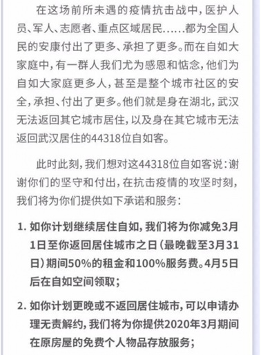 為身在湖北仍無法返回其它城市以及身在其它城市仍無法返回武漢,且計劃返程后繼續租住自如的租客減免部分租金服務費;為計劃3月31日后返回或不返回的,提供無責解約服務,同時提供3月期間原房屋的免費個人物品存放服務;自如管理層自愿進行一季度降薪20%-50%,合并用于補貼上述費用減免舉措。