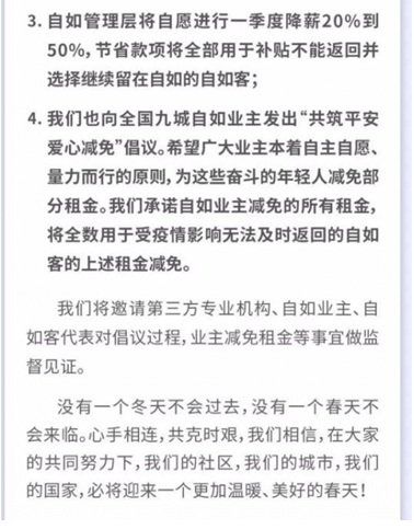 三、自如管理層自愿進行一季度降薪20%-50%,節省款項全部用于補貼不能返回并選擇繼續留在自如的租客。