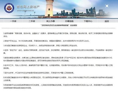 房訊網訊 據“青島網上房地產”消息,青島將開展為期100天的“2020青島百日萬店消費季”活動。為助力青島市房地產市場穩定發展,倡導參展企業開展打折促銷,團購優惠、推出特價房,給予二手房租售交易傭金優惠等活動。
