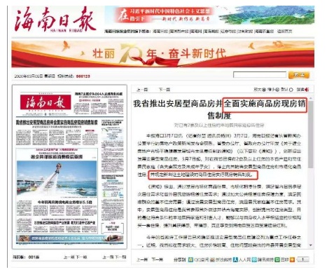 3月7日晚,海南省委辦公廳、省政府辦公廳印發了《關于建立房地產市場平穩健康發展城市主體責任制的通知》(以下簡稱《通知》),提出發展安居型商品住房,以及實行本地居民多套住房限購政策和商品住房現房銷售制度等。