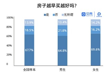 那么,買房是越早越好嗎?從貝殼調(diào)研數(shù)據(jù)來(lái)看,67.7%的受訪者表示贊同,女生更熱衷于早買房。此前,在貝殼找房的《2020女性居住現(xiàn)狀調(diào)查》中,66%的女生希望婚前擁有一套屬于自己的房子,95后女生持此觀點(diǎn)的甚至高達(dá)7成。而從貝殼找房的二手房交易數(shù)據(jù)來(lái)看,購(gòu)房者也有日趨年輕化的趨勢(shì)。