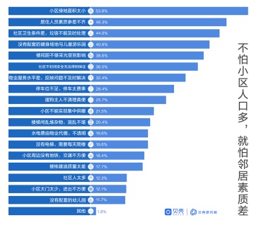 硬件配套方面,小區(qū)綠地面積太小和衛(wèi)生條件差是消費(fèi)者所面臨的兩個(gè)最大的居住痛點(diǎn)。受訪者中,53.8%的人表示當(dāng)前居住小區(qū)存在綠化面積不足的問(wèn)題,44%的住戶正遭受著社區(qū)衛(wèi)生條件差、垃圾不能及時(shí)處理的生活困擾。此外,缺乏配套的健身場(chǎng)地和兒童游樂(lè)園、樓間采光不足、社區(qū)不封閉無(wú)法保證安全等也是影響消費(fèi)者居住體驗(yàn)的重要因素。