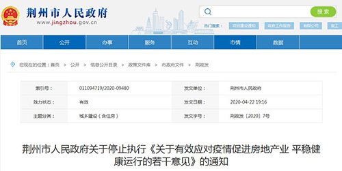 荊州市人民政府關于停止執行《關于有效應對疫情促進房地產業 平穩健康運行的若干意見》的通知