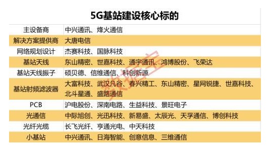 根據券商研報,下面就5G基站建設受益的核心標的做系統梳理。主設備商:中興通訊、烽火通信;通信解決方案提供商:大唐電信;網絡規劃設計:杰賽科、國脈科技;基站天線:東山精密、世嘉科技、通宇通訊等;天線振子:碩貝德、信維通信等;射頻濾波器:大富科技、武漢凡谷、春興精工等;PCB:滬電股份、深南科技等;光通信模塊:中際旭創、光迅科技、新易盛等;光纖光纜:長飛光纖、亨通光電等;小基站:中興通訊、日海智能、三維通信等。