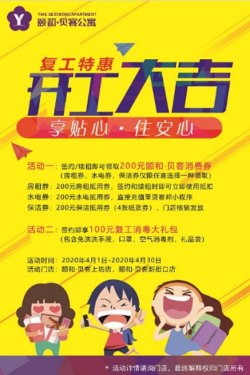 歷年的春季都是住房租賃市場的旺季,租房、換租需求旺盛。3月以來,隨著各地復工復產全面開啟,租房市場也開始回暖,租房需求大幅回升。另一方面,為促進全國經濟快速復蘇,國家也推出各項拉動消費政策。頤和·貝客積極把握市場回溫的有利時機,并響應國家政策,為租房者推出一大波復工優惠和老帶新活動,切實惠及租房人群。