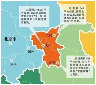 “北三縣”是河北省廊坊市三河、大廠、香河三個區域的統稱,地處北京、天津之間,與廊坊在地域上不相連,成為了一塊飛地。“北三縣”與通州雖然分屬不同的行政區劃管轄,關系卻異常緊密,出現了北京是總部、生產研發在“北三縣”,北京工作、生活在“北三縣”等現象。目前,通州已經成為北京城市副中心,北京的發展“邊界”向外延展,“北三縣”與通州之間的聯系愈加緊密,城市底板卻落差很大,迫切需要解決雙方在產業結構、交通規劃、生態環境等多方面存在“不協調”問題。